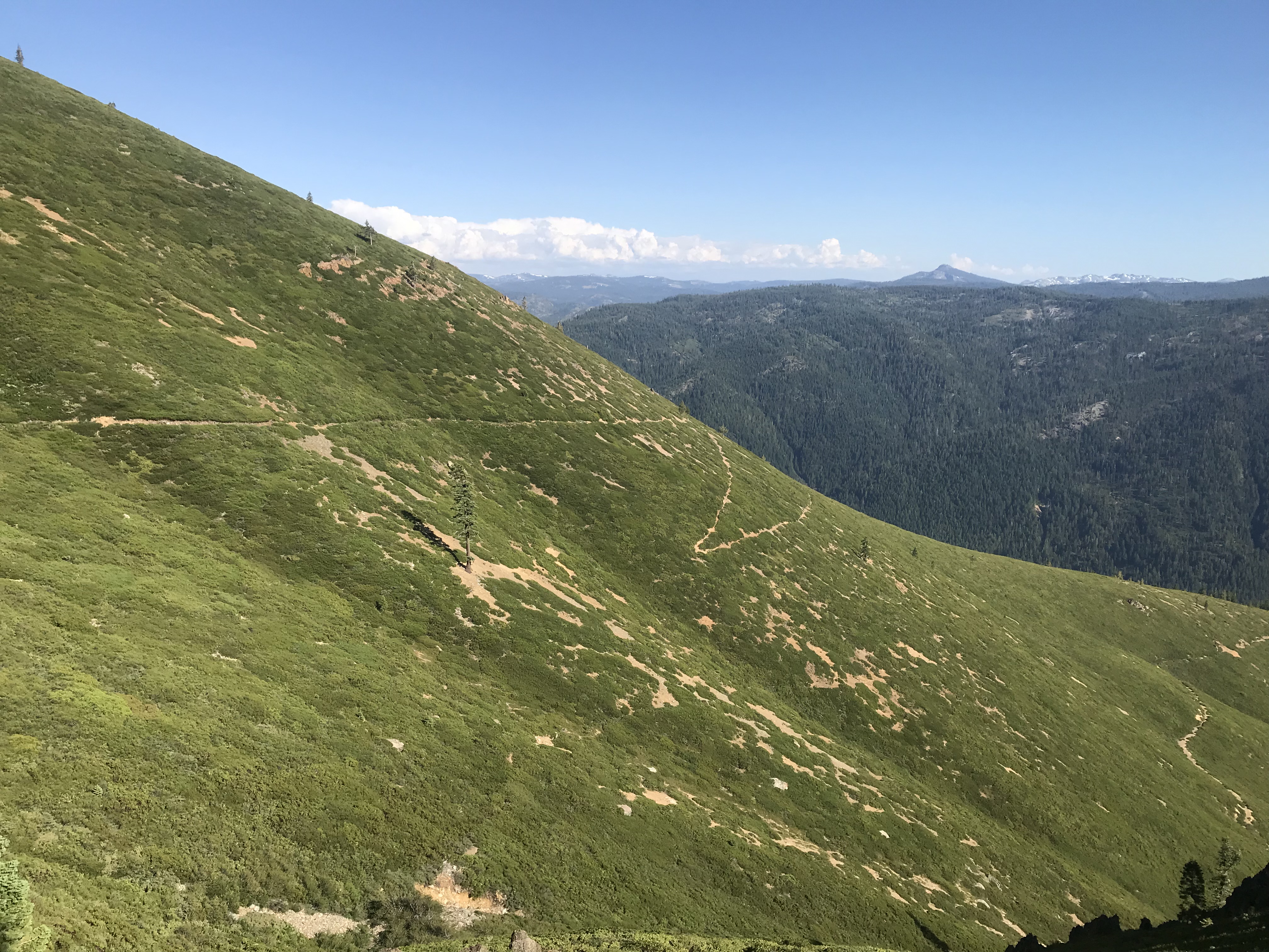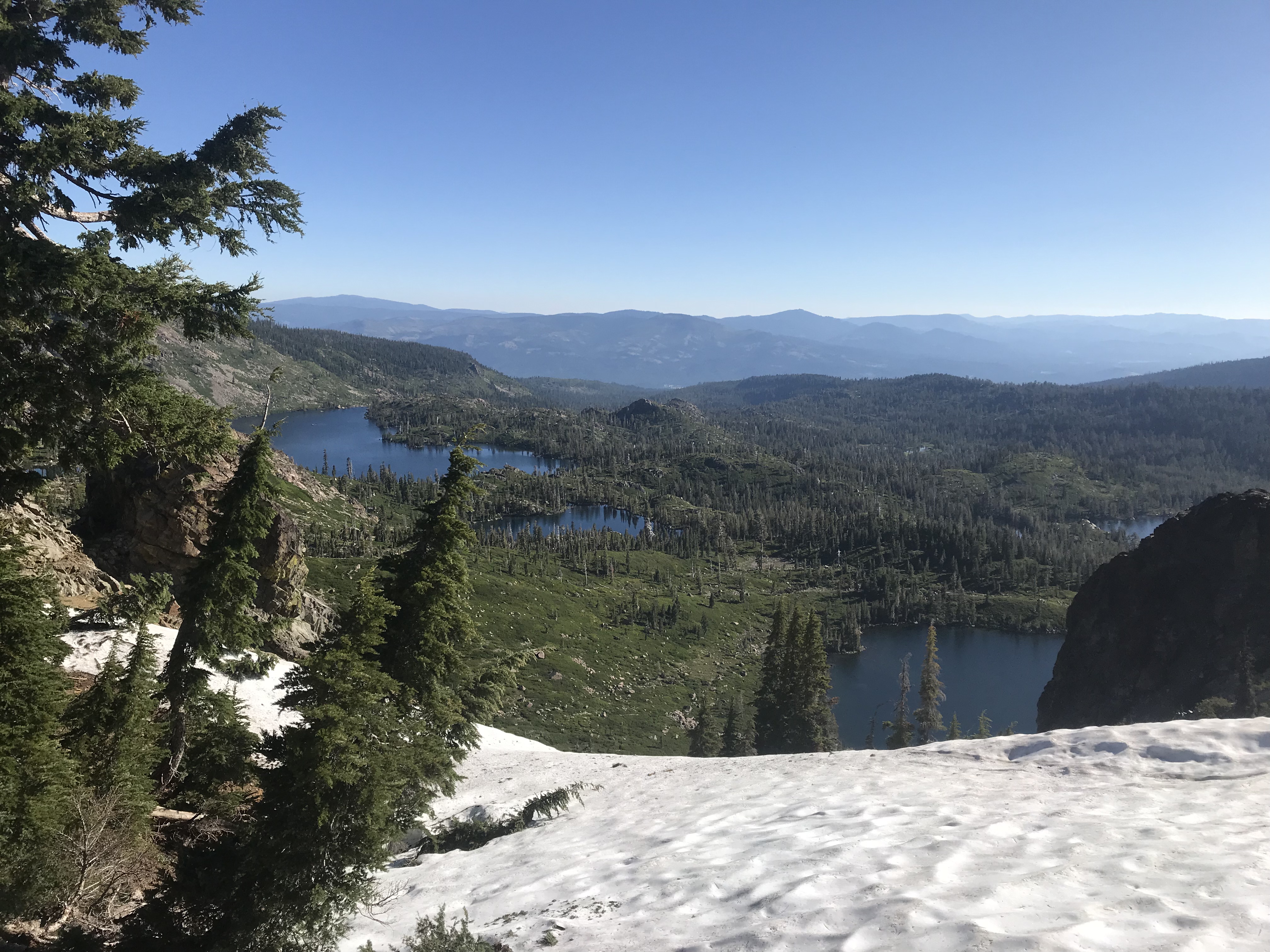 Fin vandring på bergskammen. Passerade Anderson peak och Benson hut. Sedan ner till Donner pass. Liftade vid Hwy 40 i ca 20 min innan jag fick lift av ett äldre par med stuga utanför Truckee. Dom hade redan plockat upp Shadow vid Donner Ski Ranch.