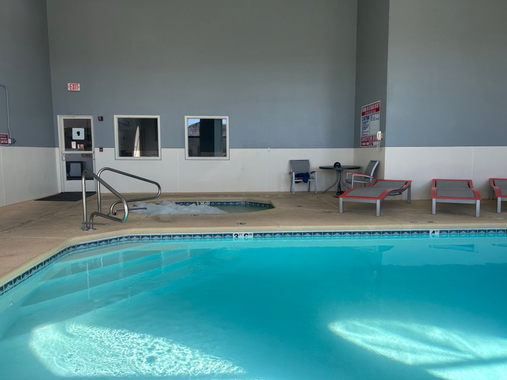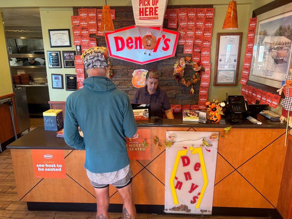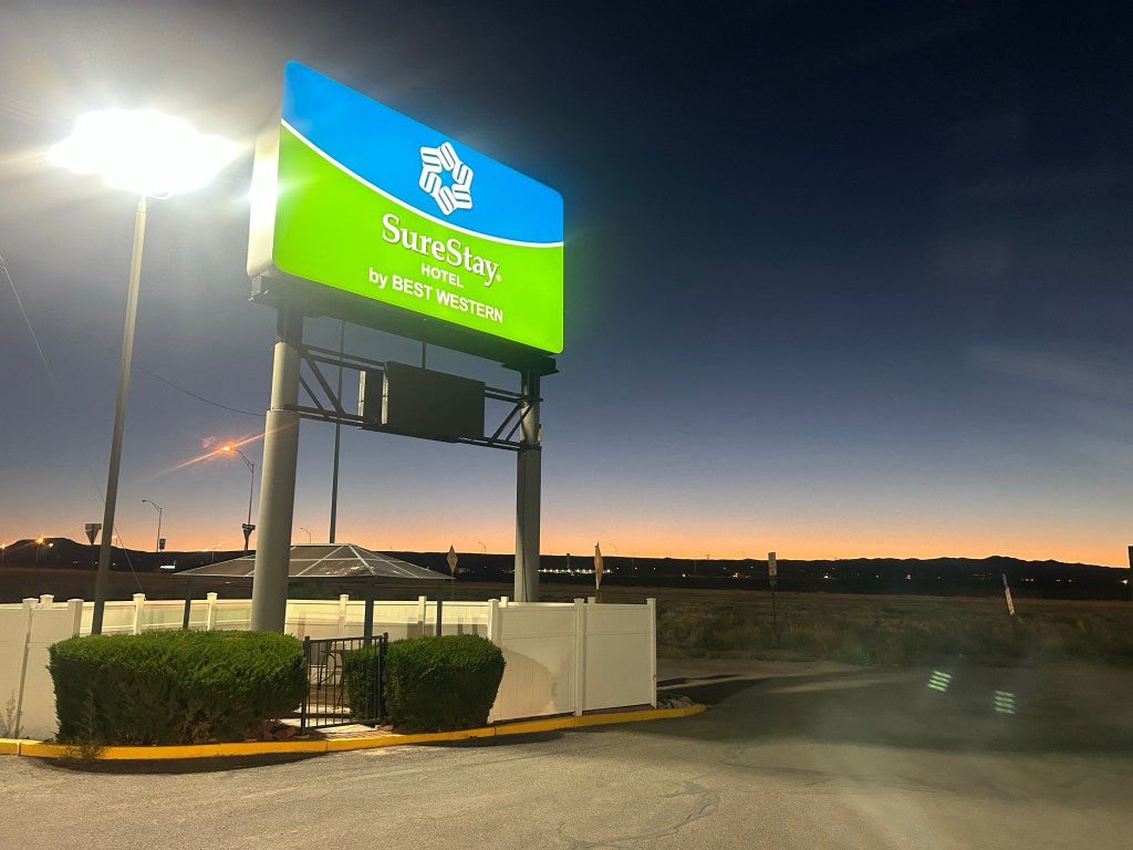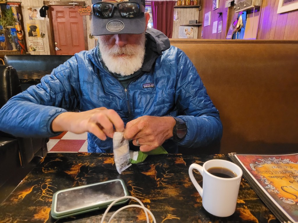 Vi sov i tält på gräsmattan vid lodgen. En hel del liv med bilar och sedan Elks som visslade och lät under natten. En kall morgon. Runt nollan. Vi gick med pannlampor till cafét när vi packat ihop oss. Vi hängde på låset där när det öppnade kl 7.