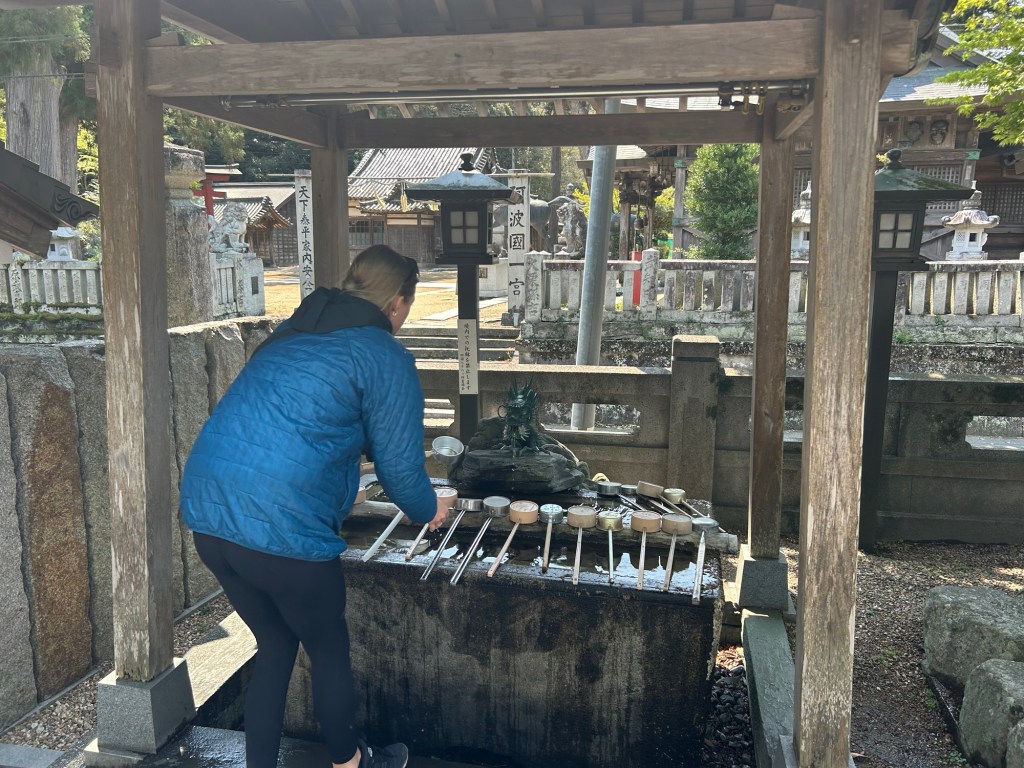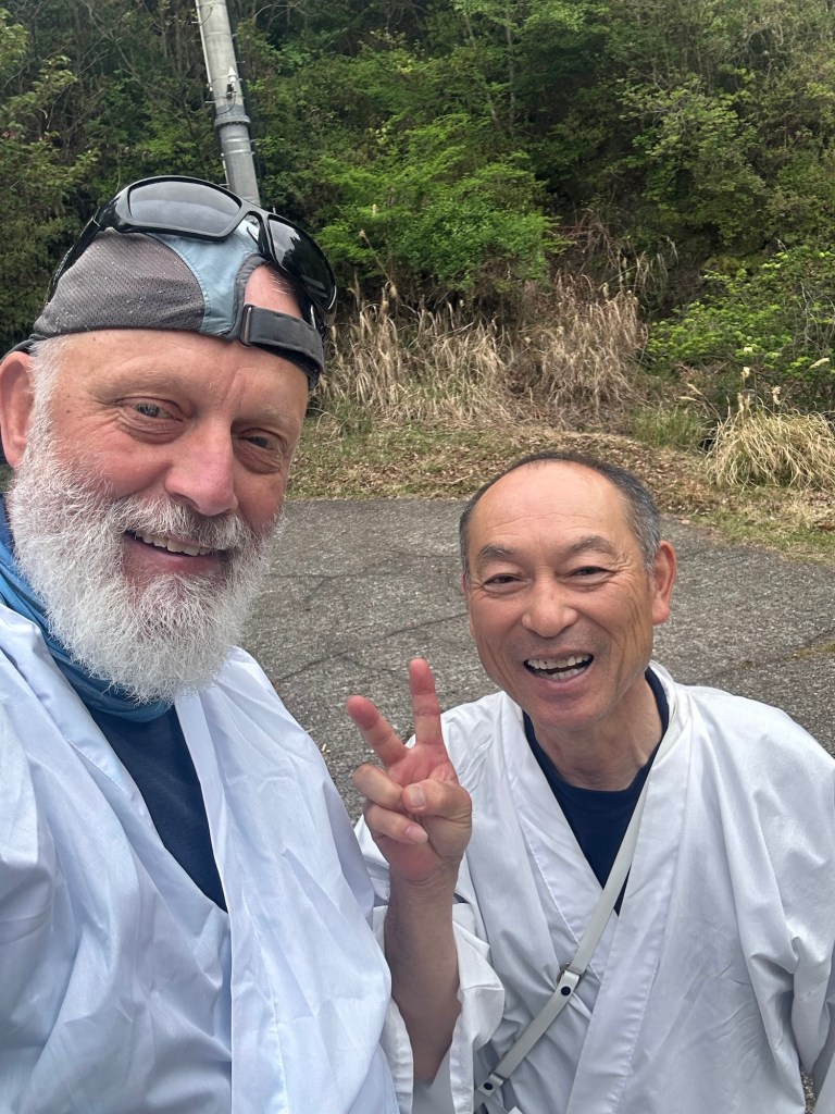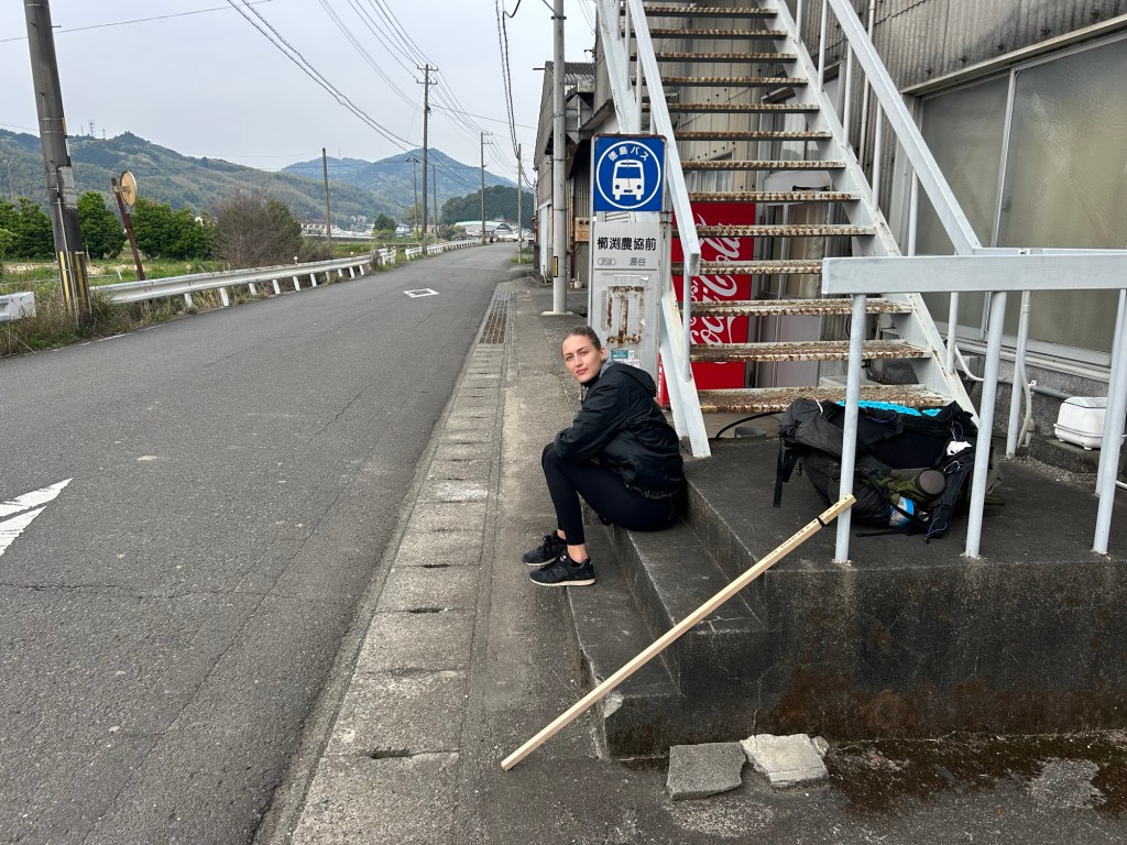 Vi gick ut och vinkade hej då och tog fler foton. Därefter promenad ut till vägen för att ta bussen ner till Tatsue. Tåg till Tokushima. Jag provianterade där sedan på 7/11. Vi gick ned till floden för att hänga där en stund innan min buss går upp till tempel 6. Tyra och jag har nu vandrat tillsammans och ”gjort” 12 tempel tillsammans, men nu ska våra vägar delas. Jag vandrar vidare på Shikoku och Tyra reser vidare i Asien.