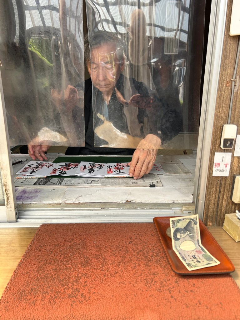 Vi delade vårt rum med en äldre japansk man. Han var 72 år och reste mellan templen med bil. Vi drack te tillsammans i tystnad. Han bjöd på japanska sötsaker och visade sin stämpelbok – en bok som bar spår av tyst tid, bläcklinjer som verkade leda inåt snarare än framåt.