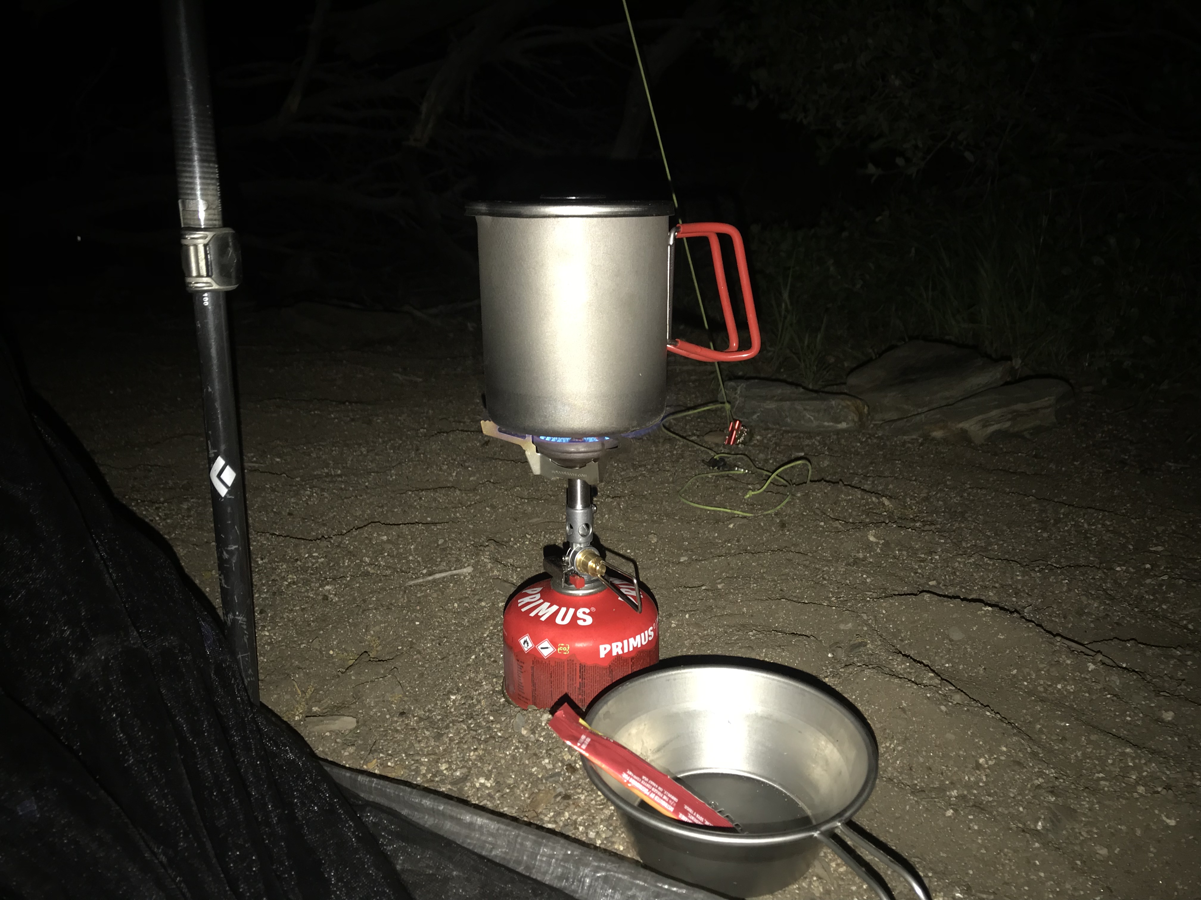 När jag är nära toppen av dagens klättring så når jag fram till en bäck där jag lagar lunch på mitt kök. Måste få lite energi för sista biten av vandringen.