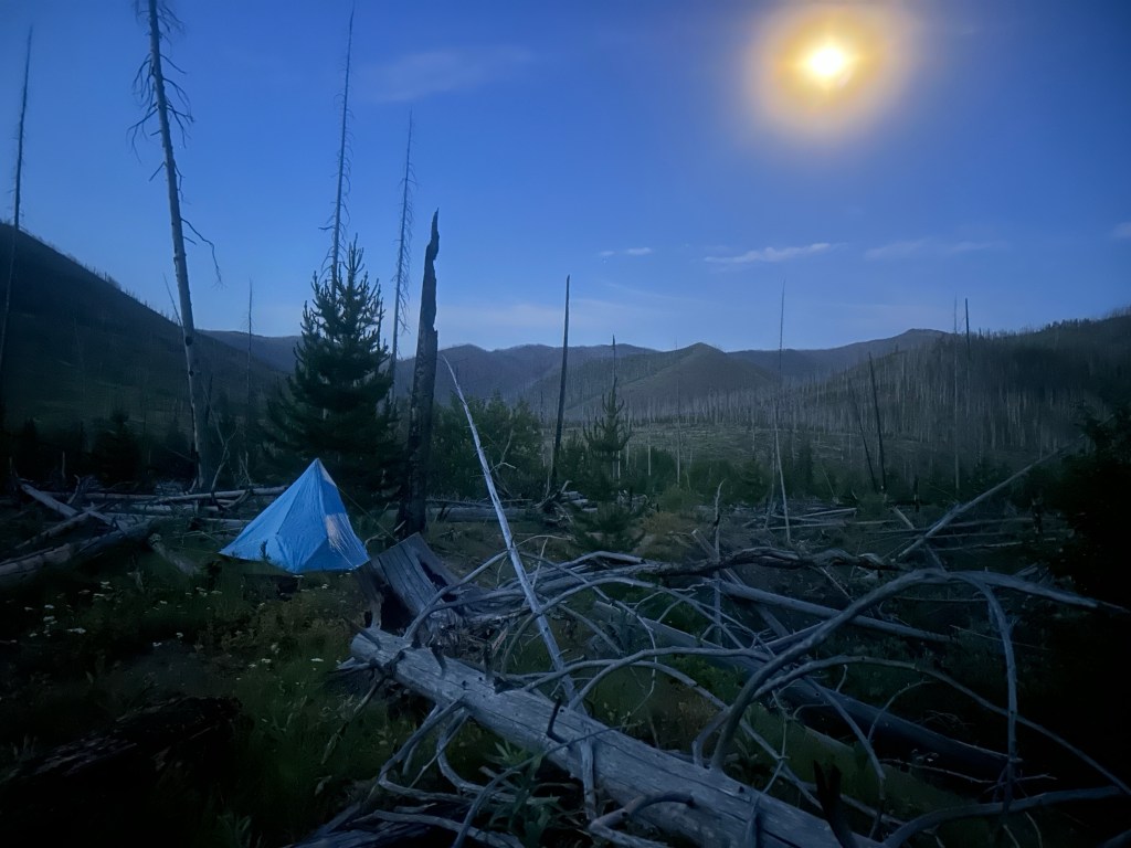 Längsta vandringen hittills och jag var ganska mör när vi kom fram. Vi beslutade oss för att slå läger vid korsningen där spotted bear alternate börjar. Det var inga avsedda tältplatser där utan vi fick leta upp ytor som var hyfsade. Middag sedan med Swede, Happy Ending och Mando. Somnade fort strax innan kl 20. Fullmåne