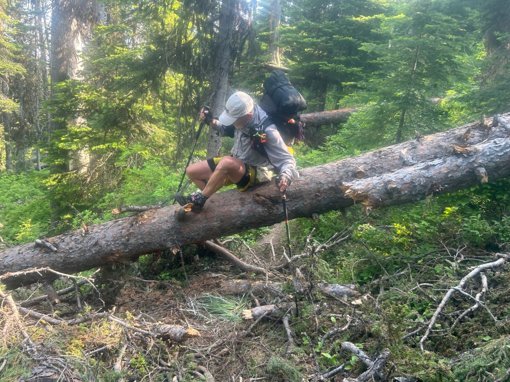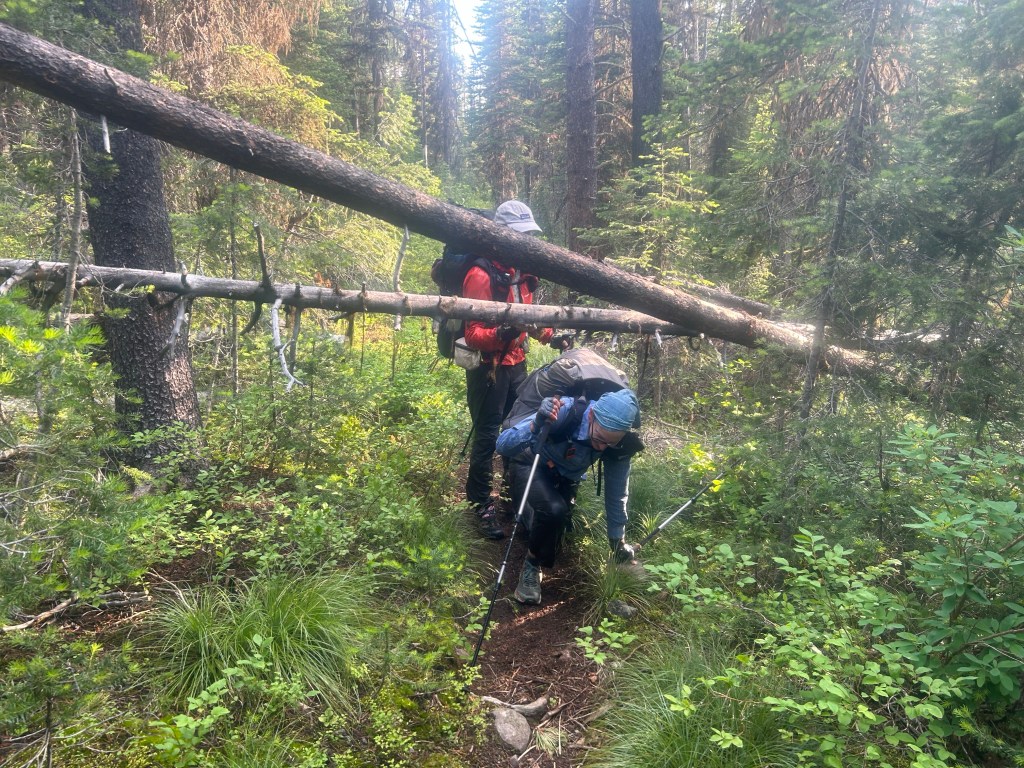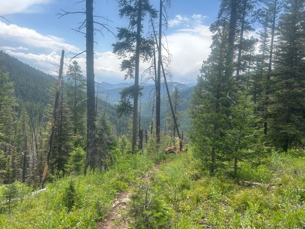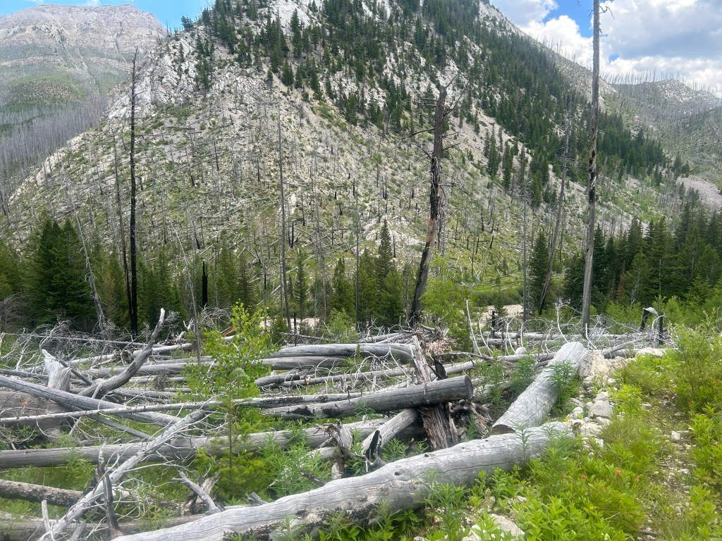 Vandring sedan länge i brunnen död skog i Scapegoat wilderness. Här var det många fallna träd som låg över leden som vi fick klättra över och under. Mycket hett då brunnen död skog även innebär ingen skugga.