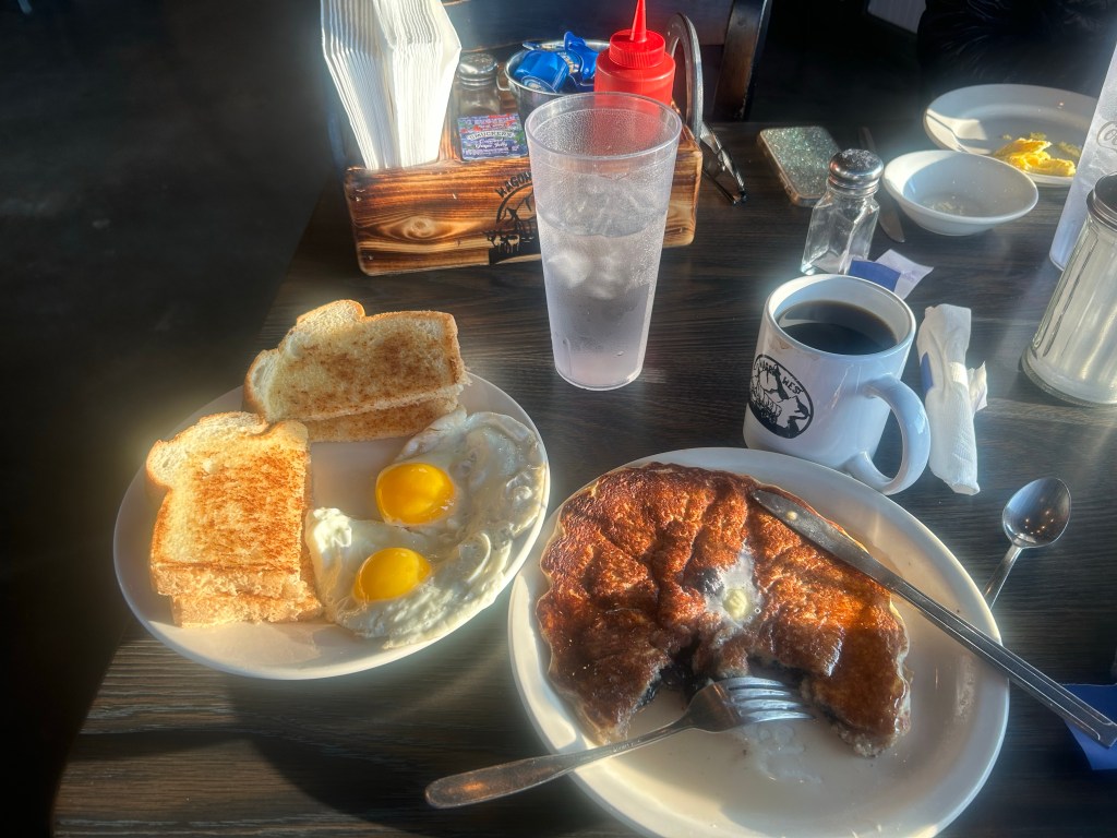Frukost. Kaffe, pannkakor, toast, ägg. Dan som kör hikers kom sedan och hämtade oss kl 8 för att köra oss 30 Miles upp till trailhead vid Benchmark.