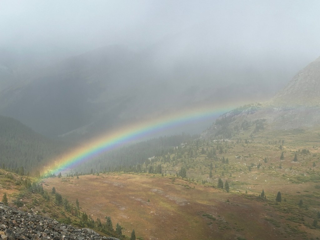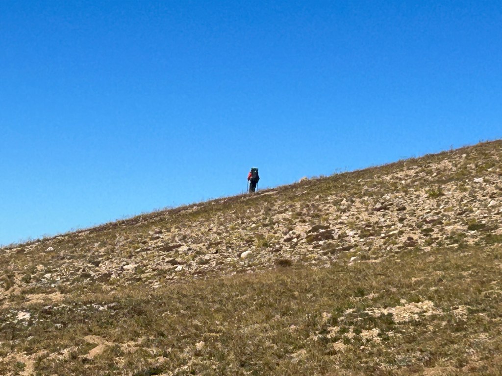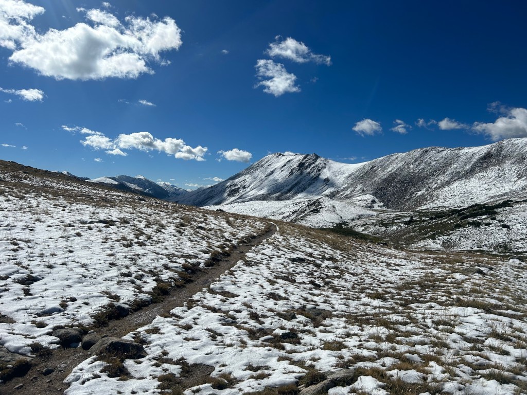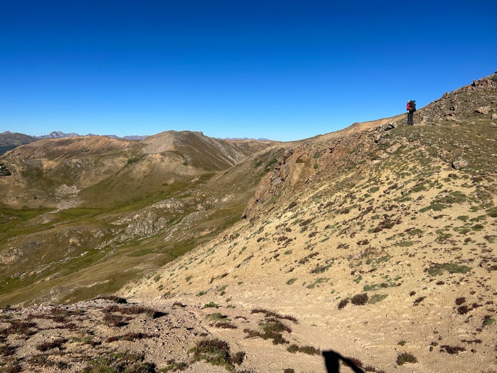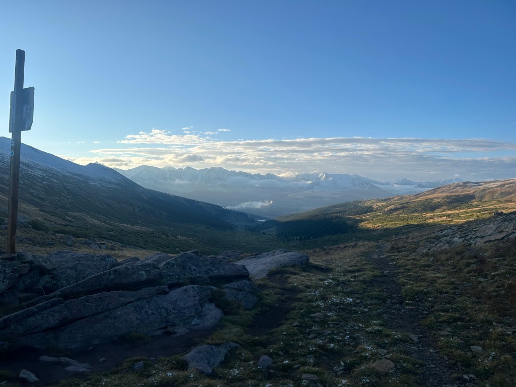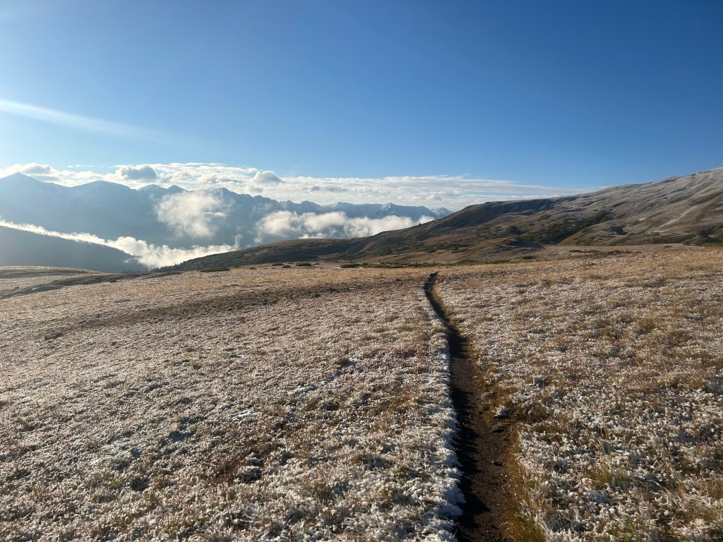 Vi började vandra strax efter 8. Stigning uppåt på snöig och isig trail i skog så solen värmde inte. Vandring blev lättare sedan när vi nådde över trädgränsen. Över Tincup pass. Sedan ner efter en gammal järnvägsbank. Upp sedan till nästa bergspass. Vi tog lunch innan sista klättringen vid en fin sjö.