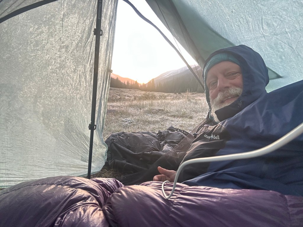 Iskall natt och morgon. Kondensen fryste till frost och is i tälttaket. Även frost och isigt utanpå. Vi beslutade att ligga kvar i tälten tills solen gick upp.