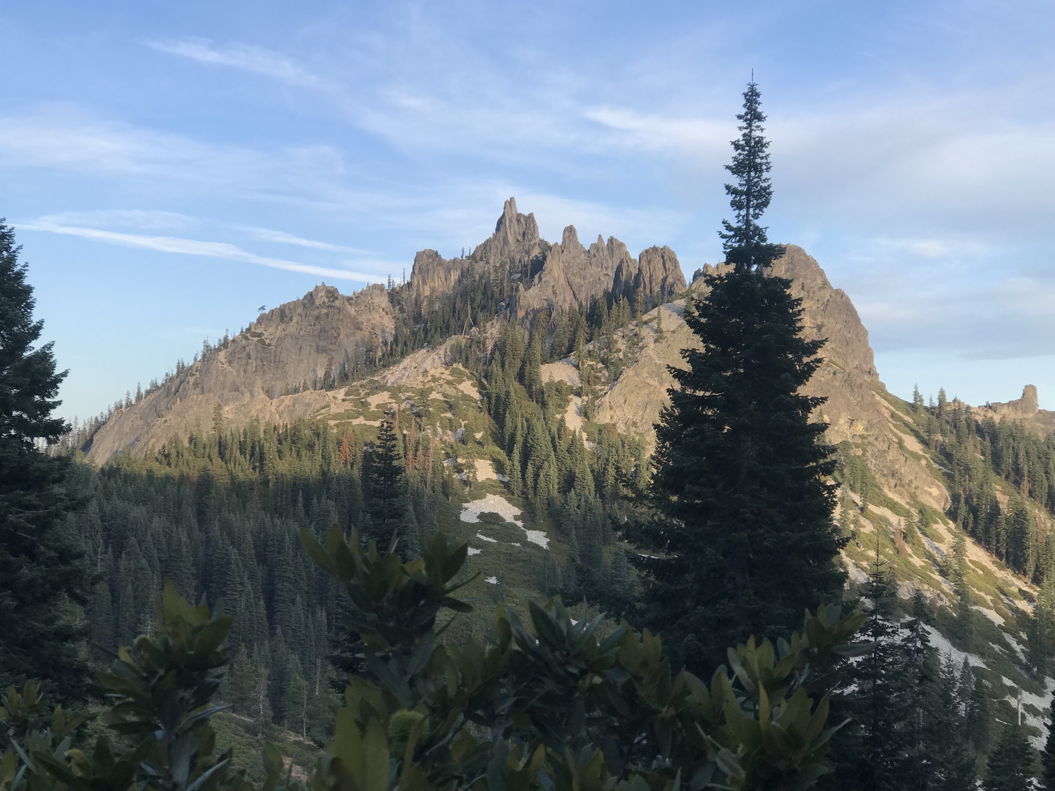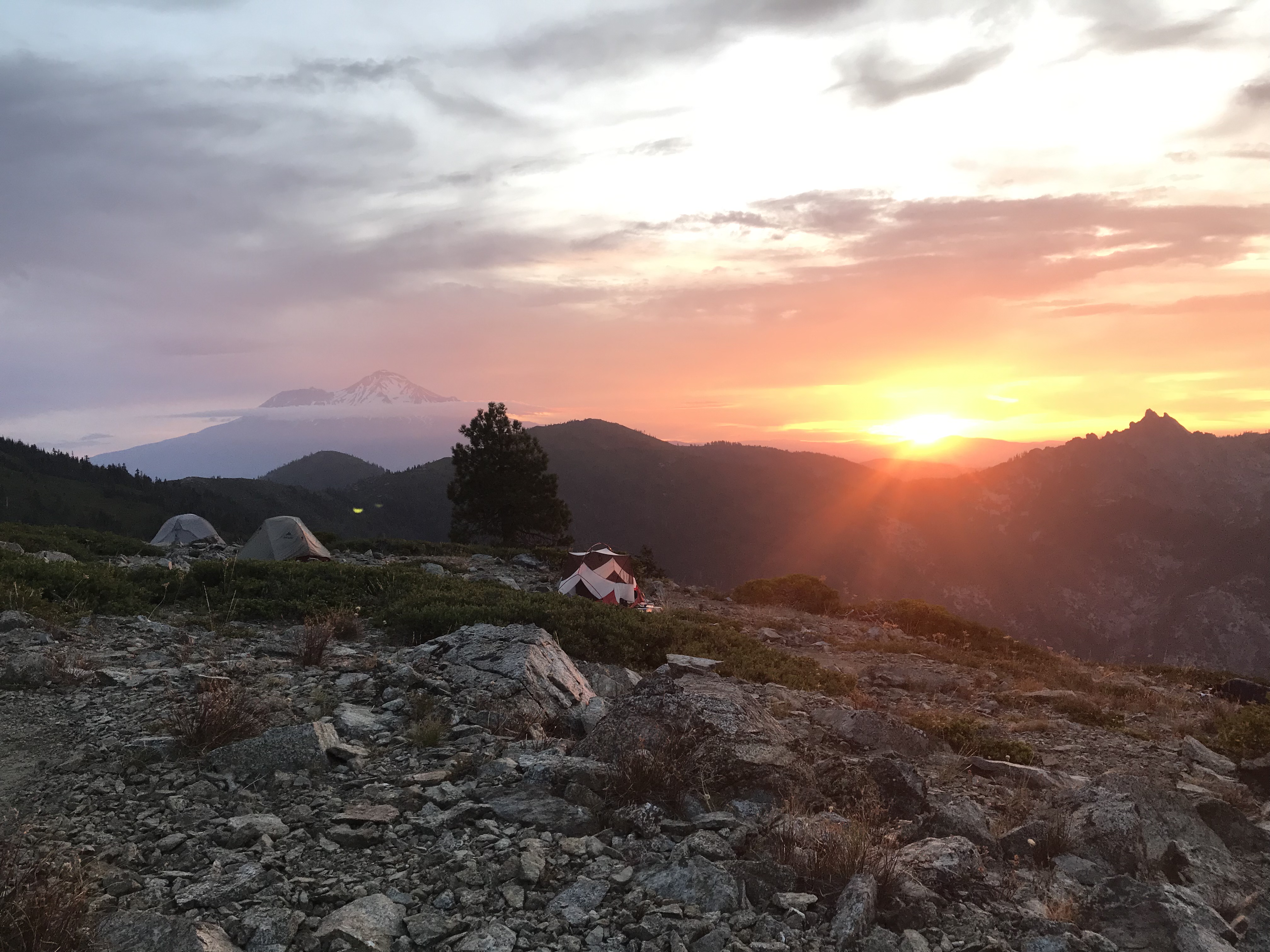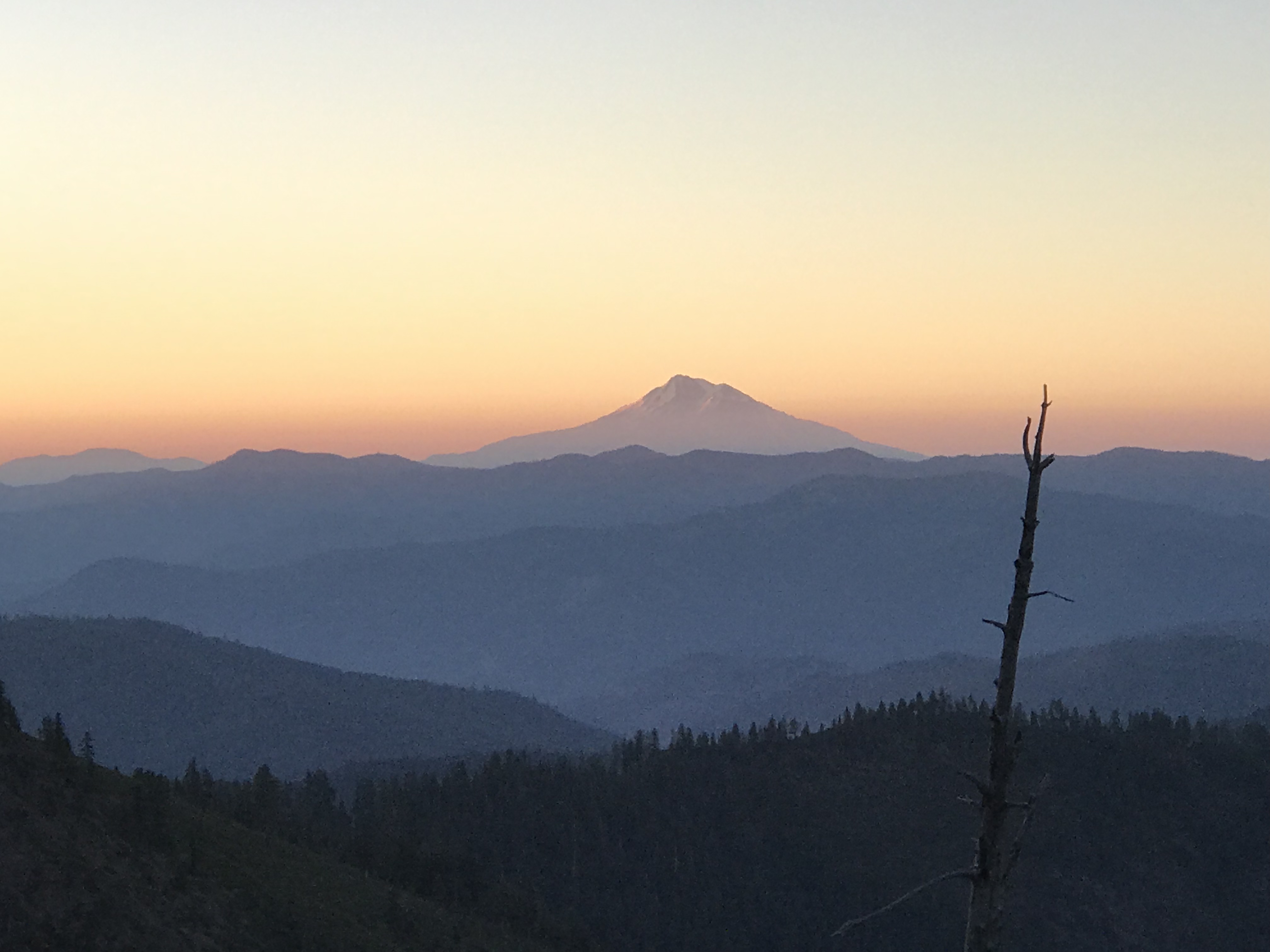 Vaknade till fin soluppgång. Högt uppe med utsikt över Mt Shasta och Craig Crags. Vandrade ut vid 7 med Guy och Addi. Machine var fortfarande kvar.
