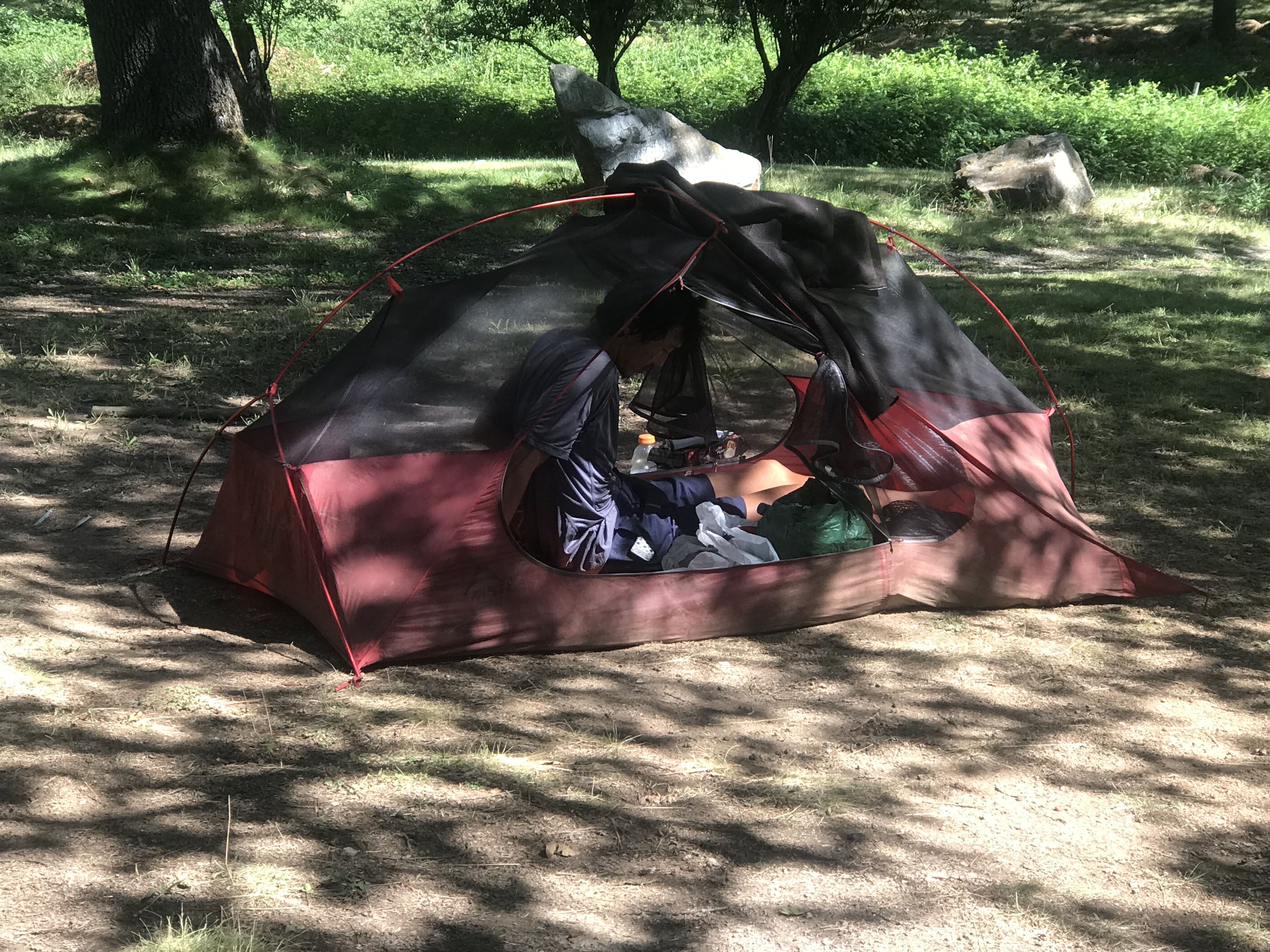Vaknade på min tältplats högt upp på berget. Passerade Machines tält. Han passerade sedan mig. Växelvandrade med Guy&Adi. Stigningar. Sedan nedför längs Grider creek.