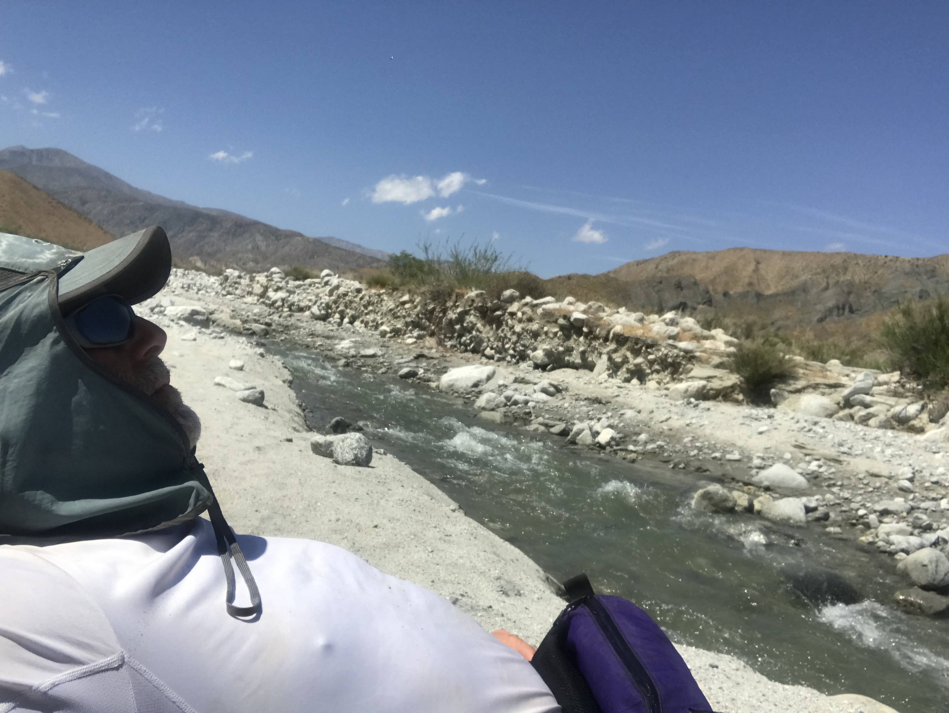 Vandrade sedan vidare. Mycket stigning sedan motorvägen, men kom sedan ner till White Water River. Där jag svalkade fötterna och tvättade strumporna. Gick sedan lite fel, då leden är bortspolad. Jag följde den uttorkade flodfåran för länge. Fick sedan gå tillbaka en bit för att hitta PCT igen.