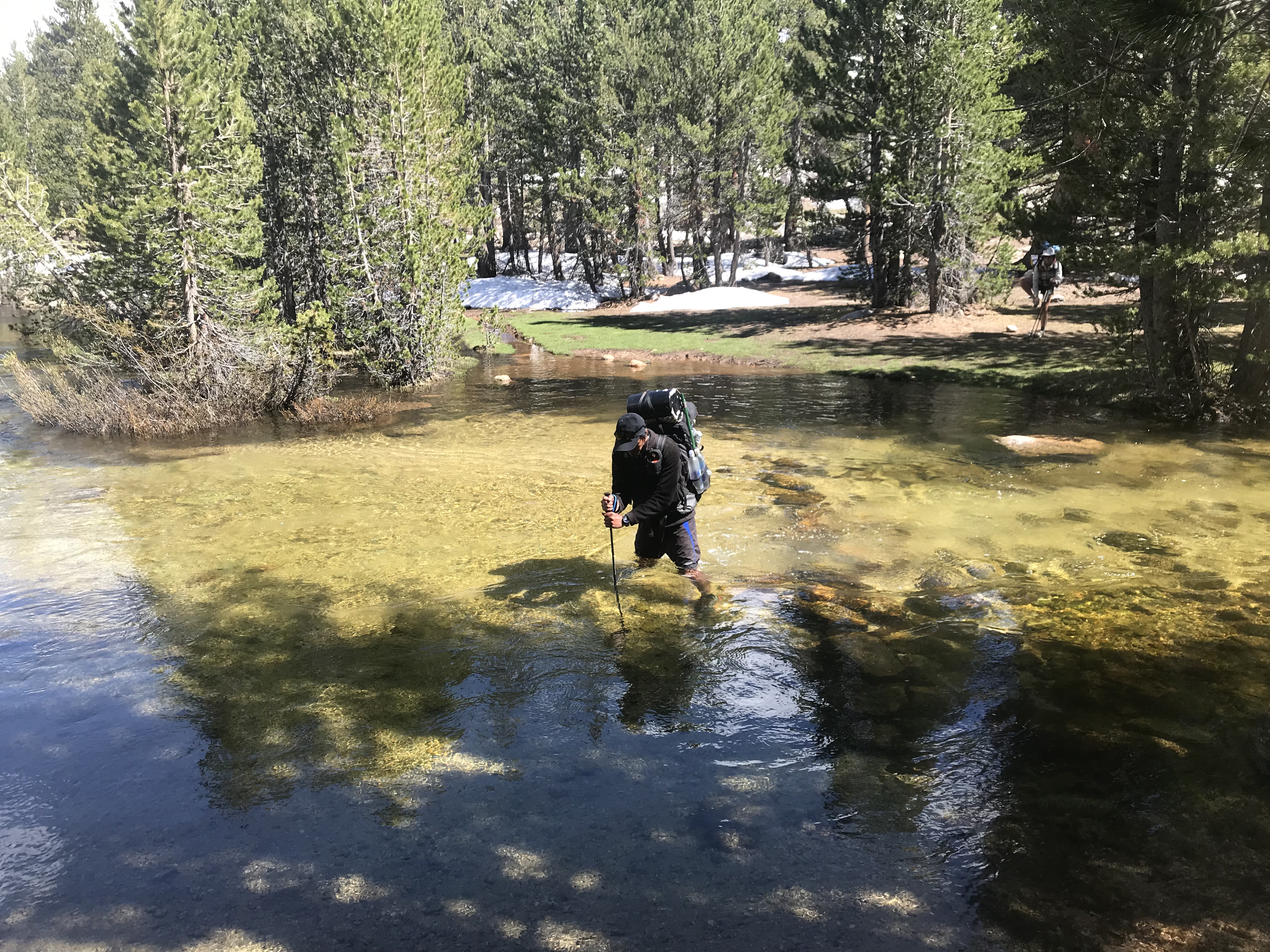 En hel del vandring genom snö fram till Wright creek där jag korsade genom vattnet tillsammans med Tinkerbell. Spartan valde en plats uppströms som var ännu bättre. Machine föll och hans saker blev blöta. Tinkerbell valde att vända tillbaka och kolla läget med Machine.