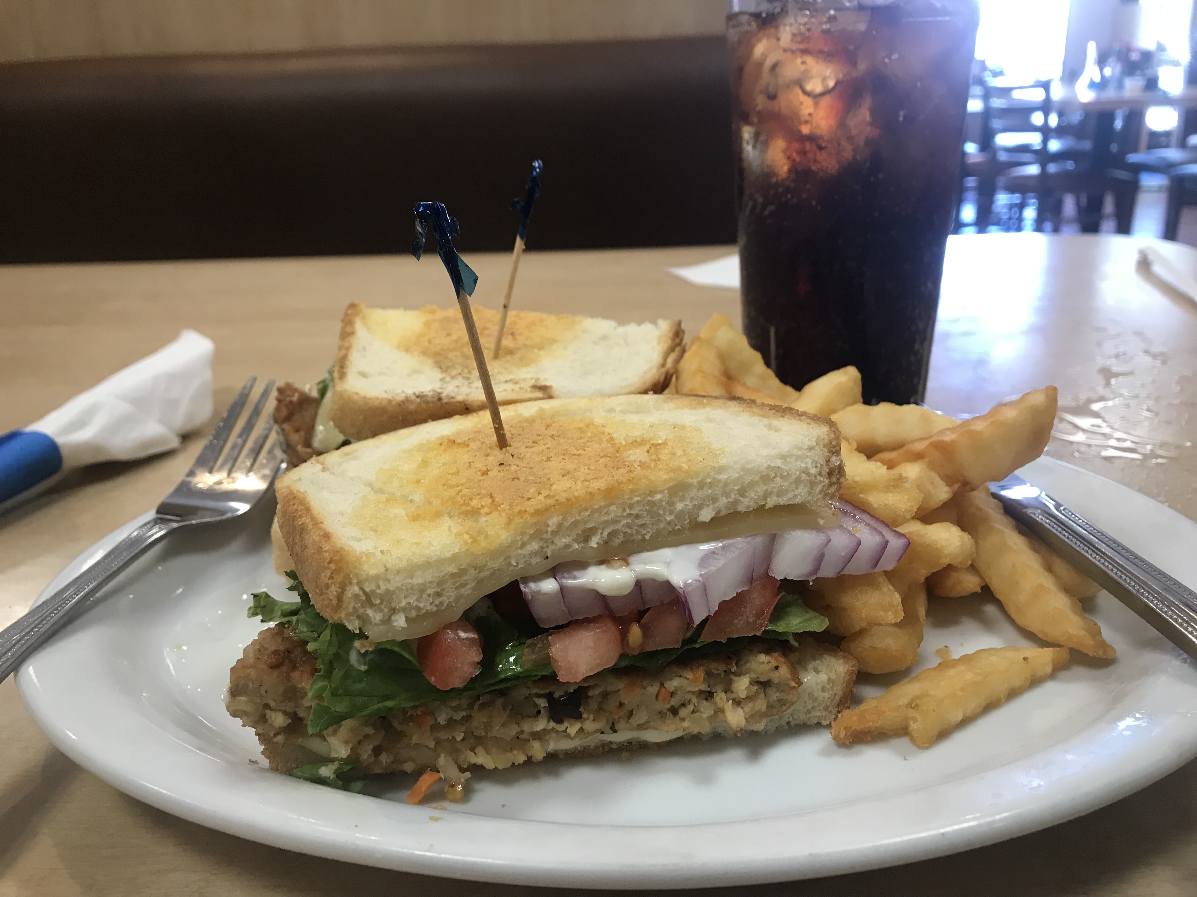 Träffade Eleven och Dale där och fick deras pizzabitar som dom inte orkade. Beställde en bönburgare med pommes.