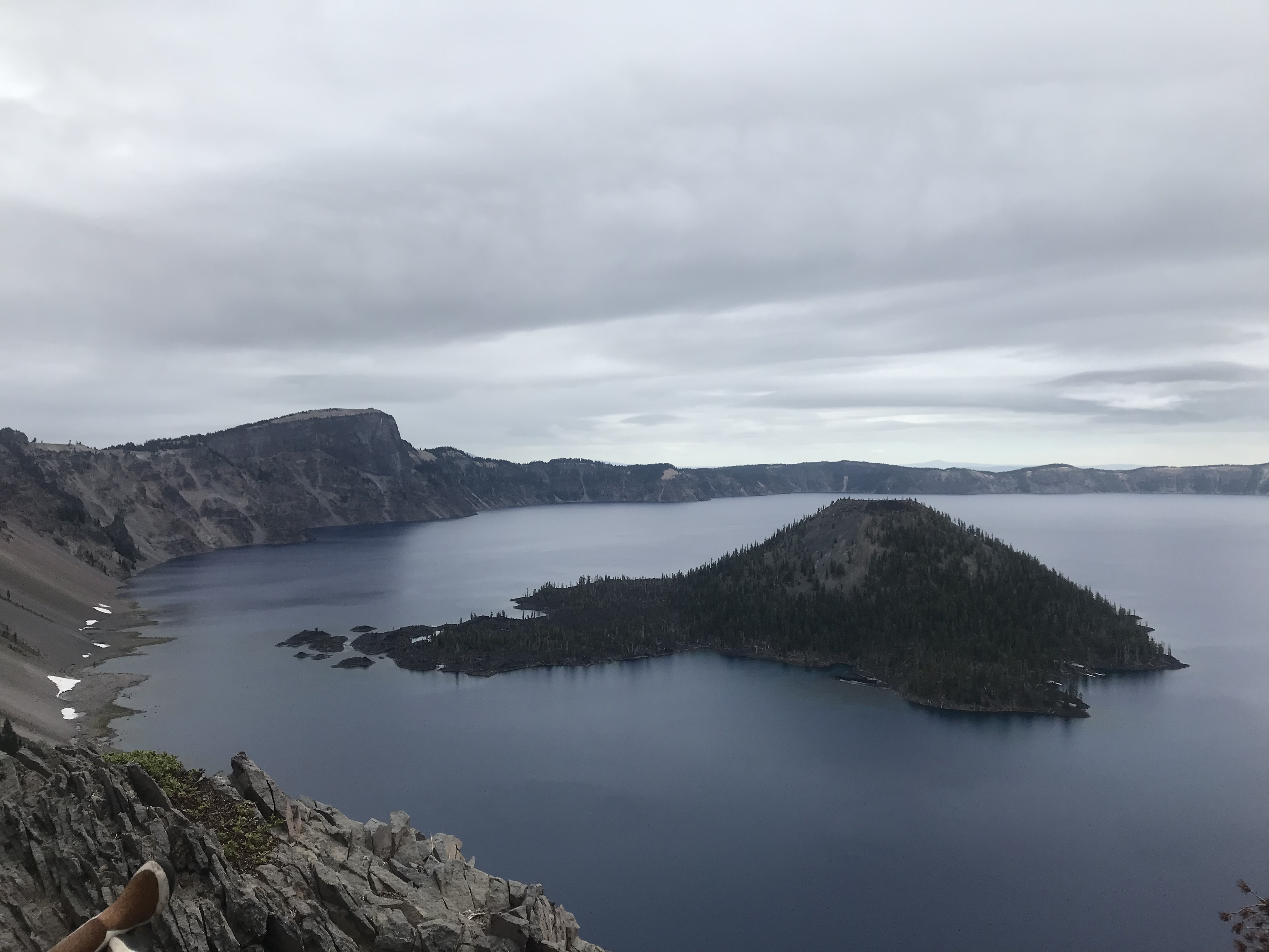 Fin vandring längs Crater Lake Rim Trail. Fantastisk utsikt. Regnet tilltog.