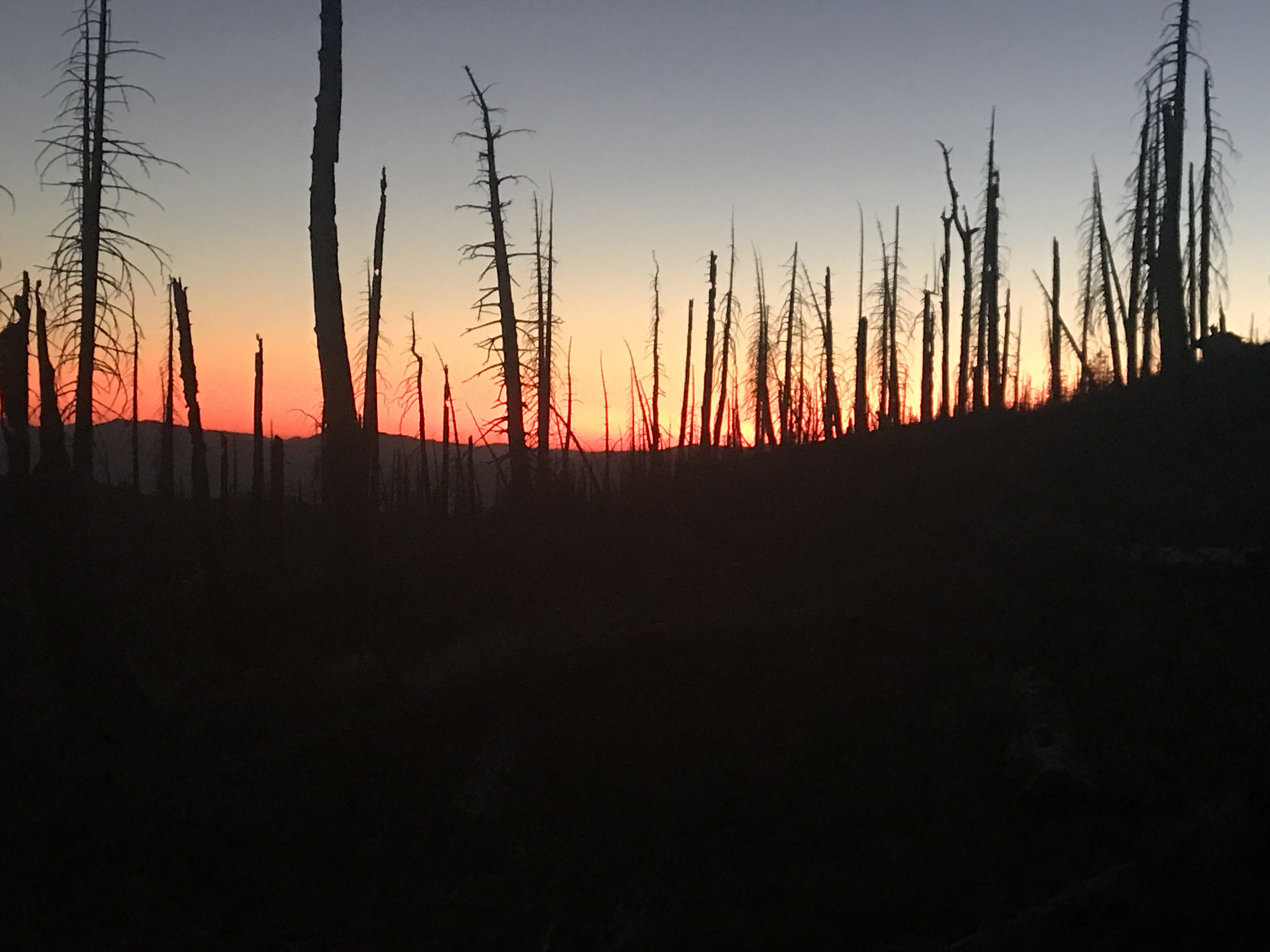 Soluppgång uppe på berget. Åt lunch med Sinatra. Kom ned till Highway 62 och gick ned till Mazama Village.